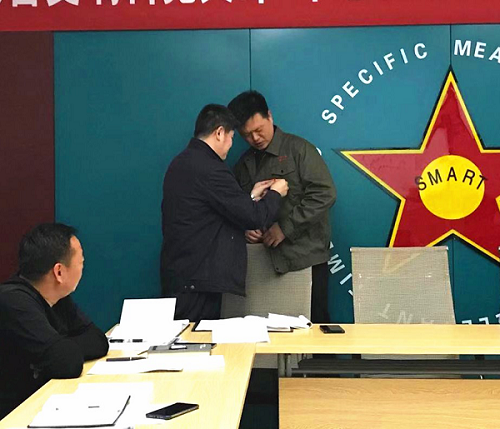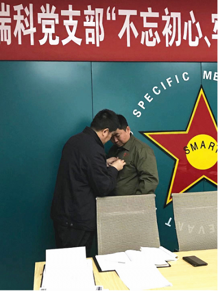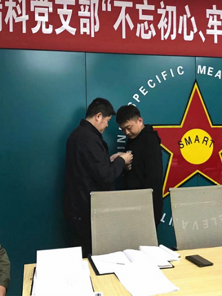 第(二)部分,首先由李全书记为公司优异党员郭建利、伊建、李礼同志发放并佩戴党徽。