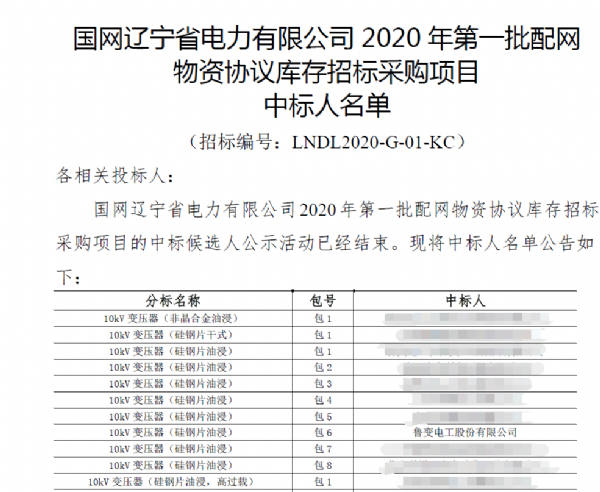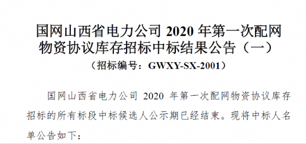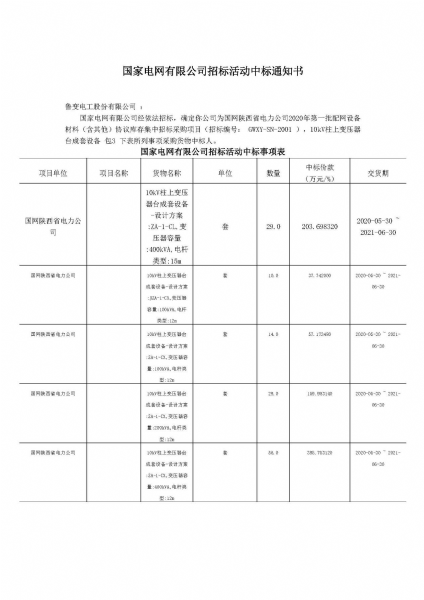 经过全体员工的奋力拼搏,我们再夺首季开门红。从国网陕西省电力公司、国网江西省电力有限公司、国网山西省电力公司、国网辽宁省电力有限公司获悉,经过激烈竞标,凭借过硬的产品质量,优良的工作作风,不凡的运作团队和良好的企业信誉,顺利中得国网陕西省电力公司2020年一批配网设备、国网江西省电力有限公司2020年一次配网(省网)物资协议库存、国网山西省电力公司2020年一次配网物资协议库存、国网辽宁省电力有限公司2020 年一批配网物资协议库存,中标金额总计:4031.21398万元。
